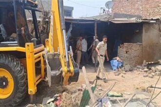 ग्राम पंचायत की जमीन में बने मकान में चला पीला पंजा, भारी पुलिस बल रहा तैनात